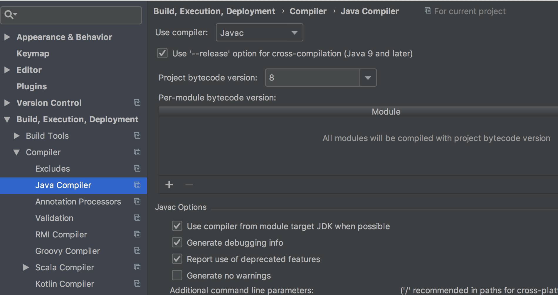 - File → Settings-> Build, Execution, Development → Compiler → Java Compiler